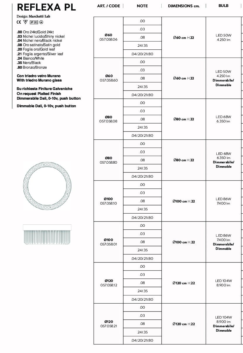- Finitura: oro 24kt, nickel lucido, oro satinato, bianco, foglia oro, foglia argento, bronzo, nero nickel,