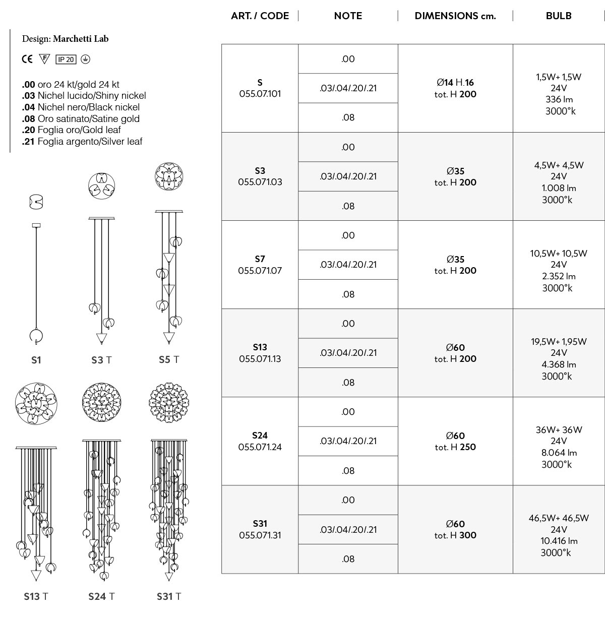 - Finish: Gold 24kt – Shiny nickel – Black nickel – Satine gold – Gold leaf – Silver leaf