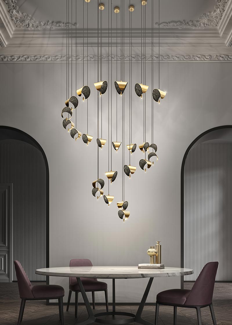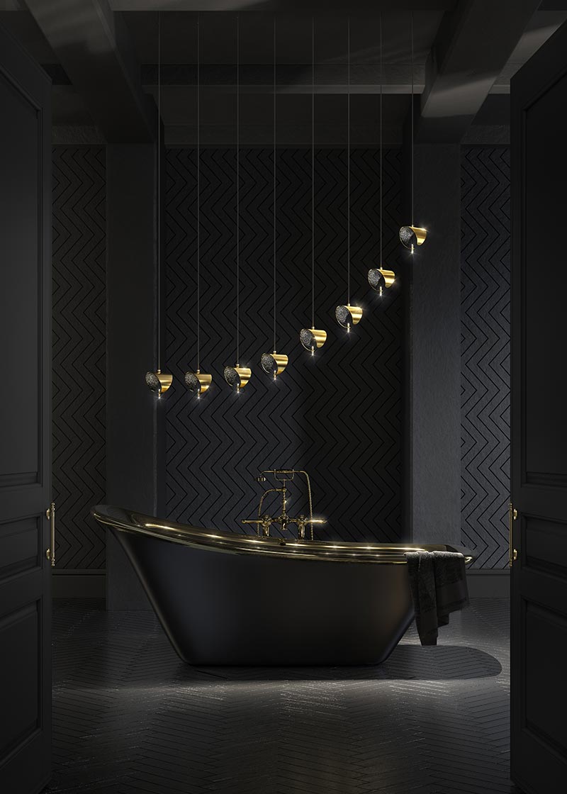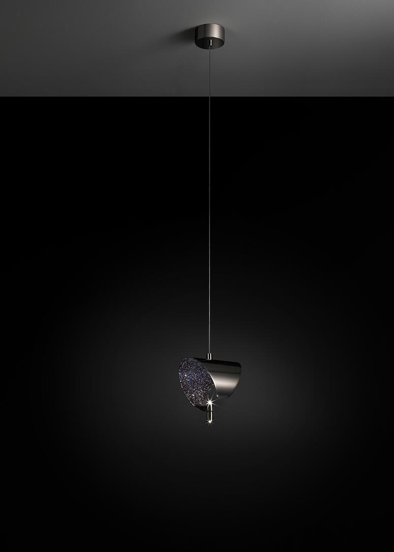 - Description: Two leds invisible but intense in brightness, illuminate a carpet of stones inside a steel bracelet with precious finishes and spread light outside. Suspension lamp made of a steel bracelet with a carpet of stones inside. Led up and down lighting.