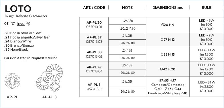 - Finitura: White, Black, Bronze, Gold leaf, Silver leaf